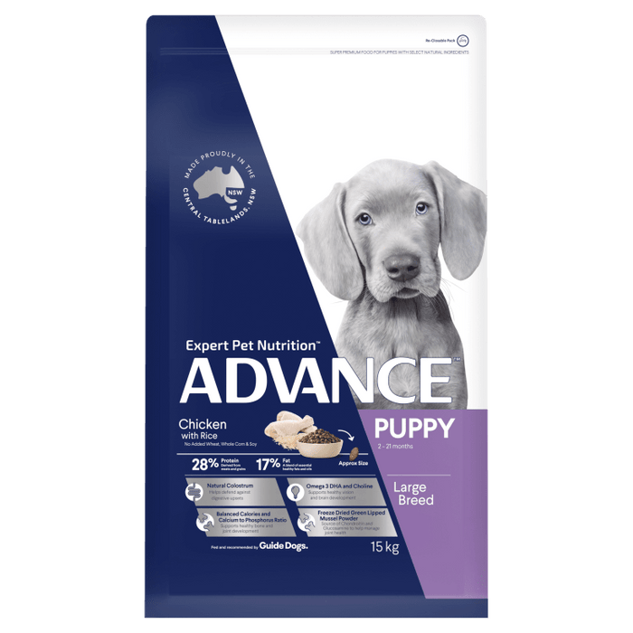 Made with real chicken and packed with a healthy balance of calories, calcium and phosphorous, Advance Large Puppy Dry Dog Food is specially formulated to support optimal growth in your puppy. Offering a natural source of colostrum for defence against digestive upset, this special puppy recipe also comes enriched with DHA and choline to support healthy brain and eye development.